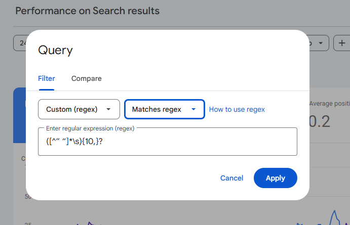 To wyrażenie regularne filtruje zapytania zawierające więcej niż 10 słów. Możesz zmienić „10” na „5” lub „25”, aby znaleźć zapytania zawierające odpowiednio więcej niż 5 lub 25 słów. Z tego artykułu dowiesz się, jak zoptymalizować stronę na długie frazy kluczowe.