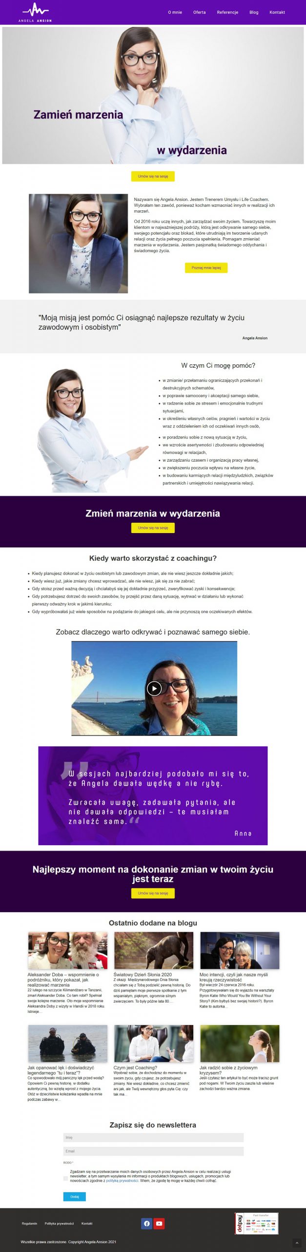 Angela jest Trenerem Umysłu i Life Coachem. Towarzyszy swoim klientom w najważniejszej podróży, którą jest odkrywanie samego siebie, swojego potencjału oraz blokad, które utrudniają tworzenie udanych relacji oraz życia pełnego spełnienia. Pomaga zmieniać marzenia w wydarzenia. Jest pasjonatką świadomego oddychania i świadomego życia.