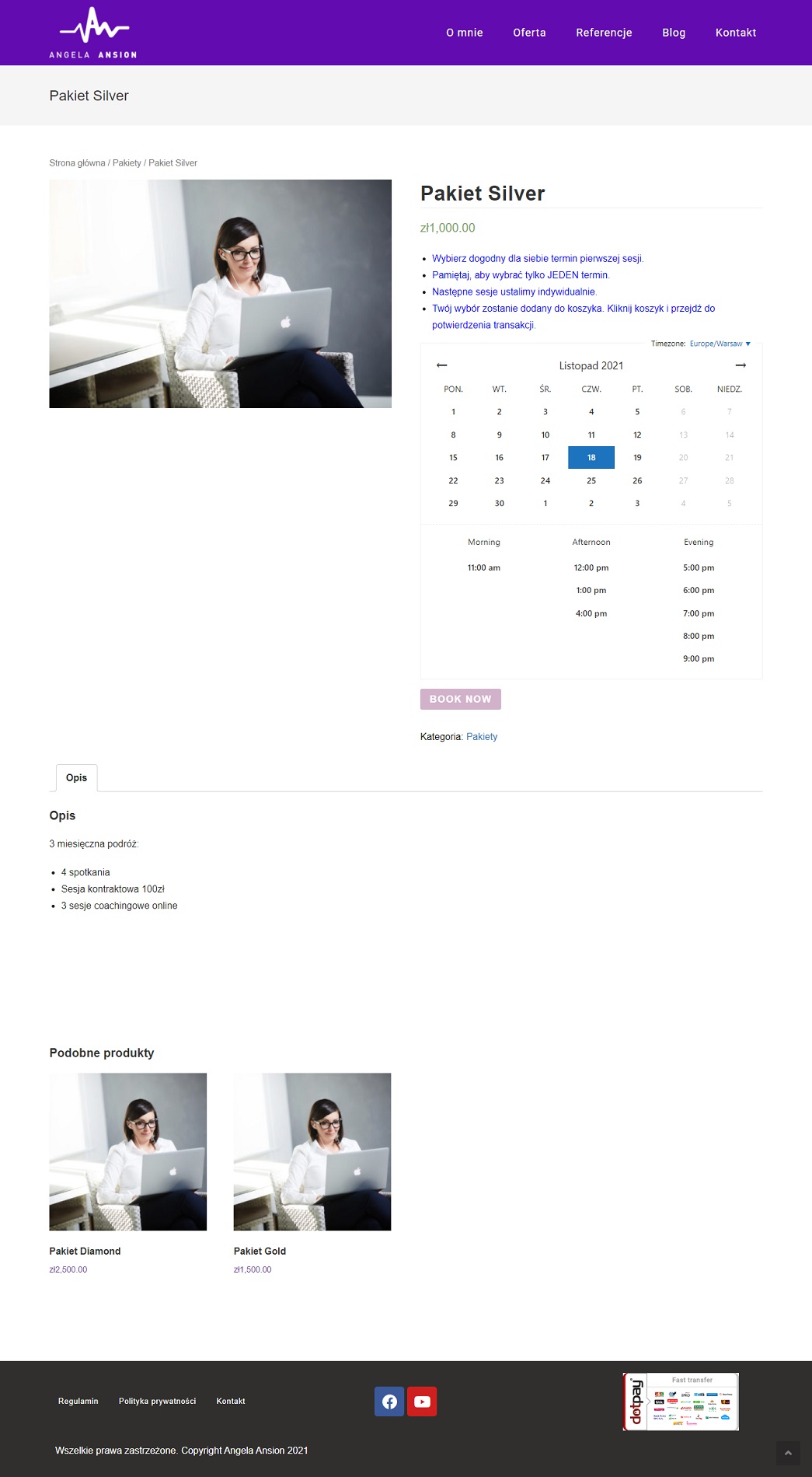 Strona wdrożona w systemie CMS WordPress z zakodowanymi elementami, kalendarz rezerwacji oraz bramka płatności Dotpay oparte o Woocommerce.