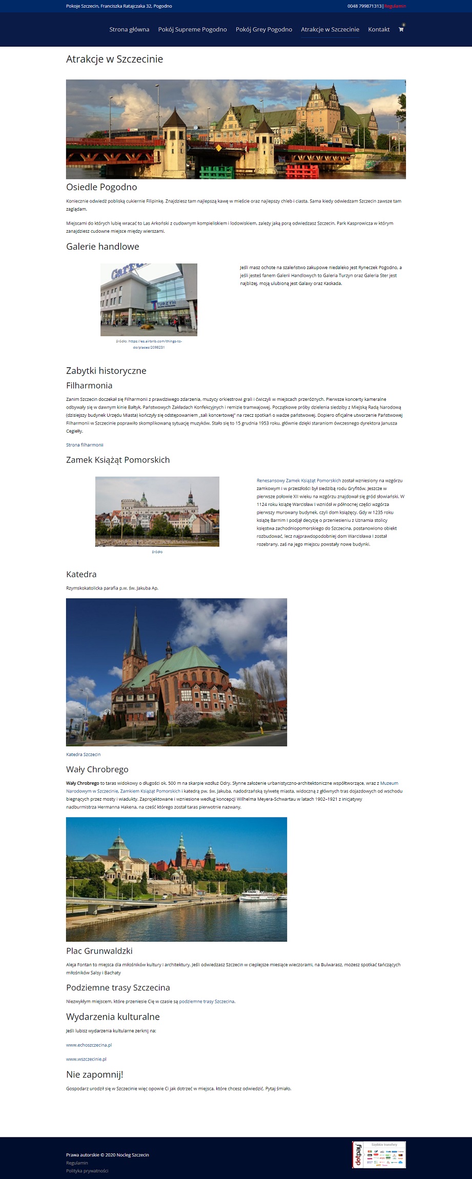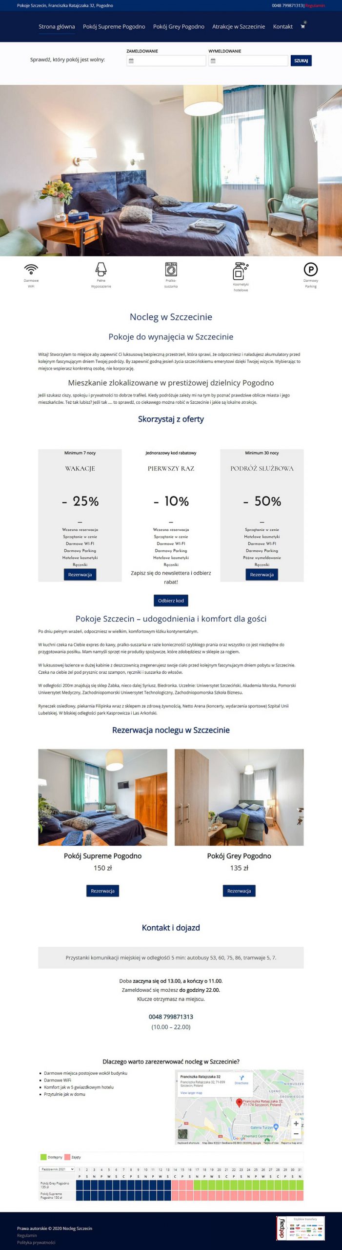 Noclegszczecin.com.pl to strona umożliwiająca rezerwacje jednego z dwóch pokoi apartamentu w Szczecinie. Właścicielka mieszkania zadbała o komfort gości oraz każdy szczegół w opisach na stronie. Wdrożony system rezerwacji pozwala na rezerwacje i opłatę na pobyt zgodnie z ustalonym cennikiem oraz godzinami zameldowania i wymeldowania.