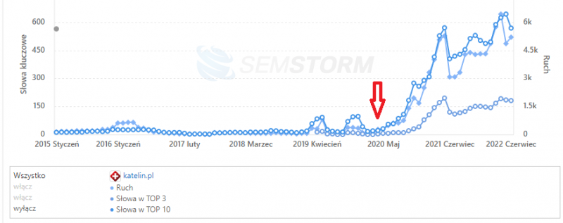 Analiza konkurencji pozwoliła wyszczególnić listę 50 fraz, które stały się wytycznymi strategii treści na stronie. Publikując co tydzień starannie zoptymalizowany artykuł na bloga i dbając o wewnętrzne linkowanie treści bloga z produktami, udało się zwiększyć marketingowe KPI.